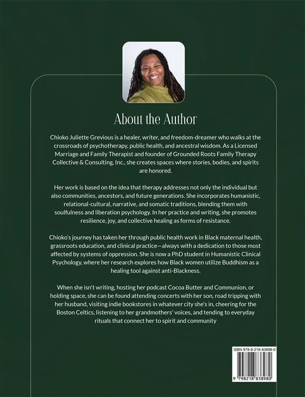 The Soul Story Journal is a sacred writing companion created by therapist and storyteller Chioko Juliette Grevious, LMFT. This guided journal invites you to pause, breathe, and reconnect with your inner wisdom. Through seven themed sections—Soul Check-In, Rhythm of Reflection, Groove & Gratitude, Breathe & Bless, Reconnection, Healing, and Ancestral Memory—you’ll explore reflection prompts, affirmations, and embodiment rituals that honor your mind, body, and lineage.